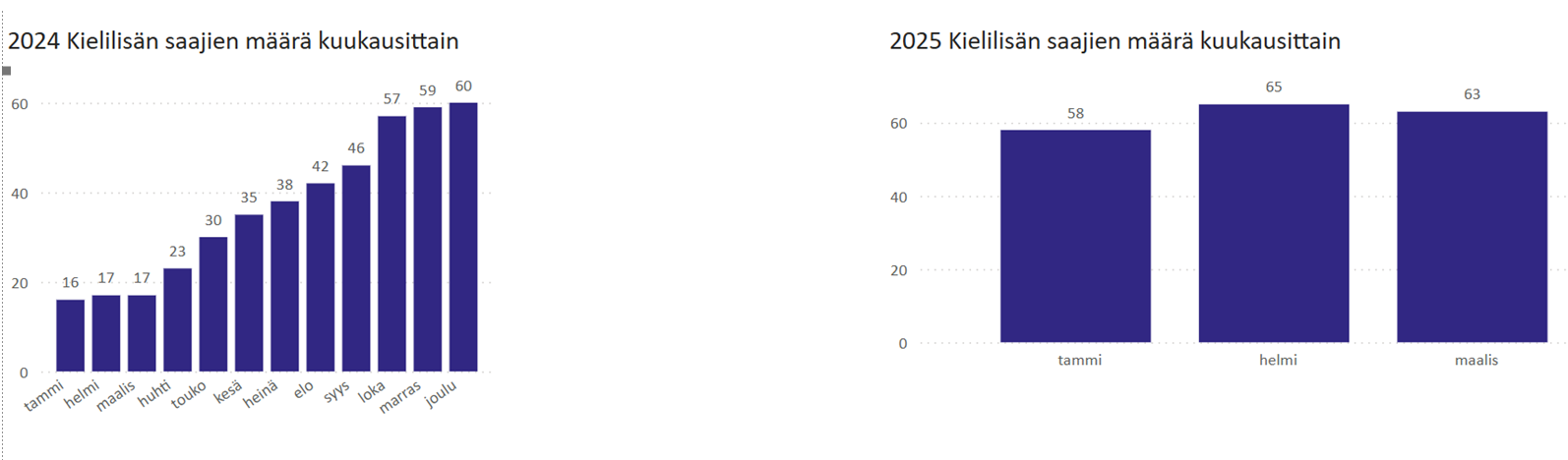 - Vid styrelsemötet 25.3.2025 presenterades social- och patientombudens utredning från år 2024. Utredningen redogör för utvecklingen av klienters och patienters rättigheter och ställning inom Vanda och Kervo välfärdsområde, baserat på de kontakter som social- och patientombudsmannen mottagit. För Nationalspråksnämnden tillhandahålls statistik från utredningen över den språkliga fördelningen av det totala antalet kontakter (908 under tidsperioden mars-december 2024):